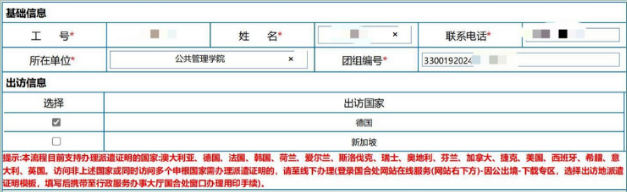 登录“浙大服务”-“Z2028:教职工因公临时出国派遣证明”流程,输入出访人个人信息及团组编号,勾选需办理派遣证明的国家名称。